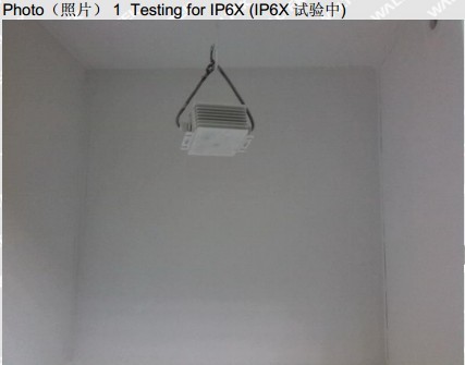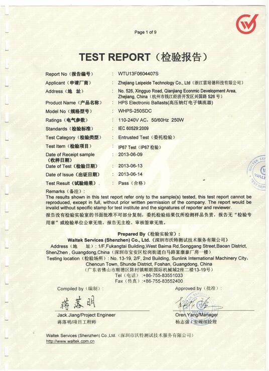 2013年6月14日,我公司产品HPS Electronic Ballasts(高压钠灯电子镇流器)通过IP67检验。