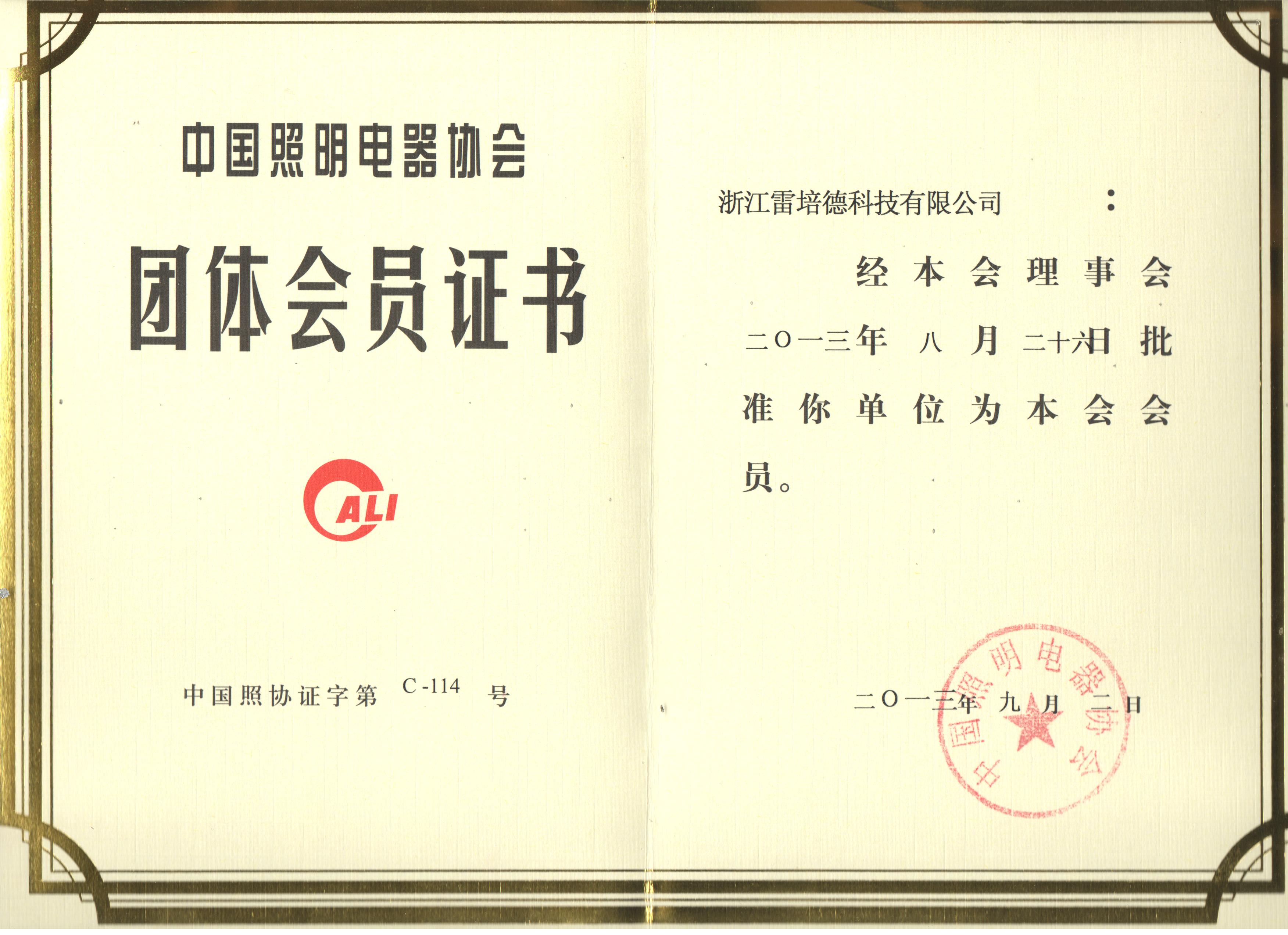 我公司经中国照明电器协会理事会批准,于2013年8月26日正式授予团体会员证书,成为中国照明电器协会的会员。