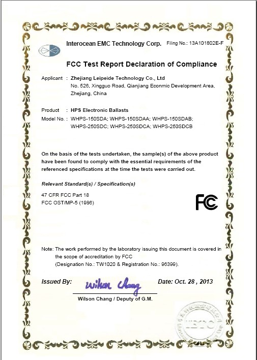 我公司通过的FCC认证产品是小功率电子镇流器(2013年10月28日正式获得证书),小功率电子镇流器主要分6种型号:WHPS-150SDA、WHPS-150SDAA、WHPS-150SDAB、WHPS-250SDC、WHPS-250SDCA、WHPS-250SDCB。此次我公司小功率产品通过FCC认证即是国际社会对我公司产品质量的肯定,对我公司产品性能参数的肯定,也是对我公司产品出口美国资质的肯定。