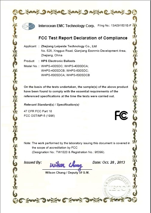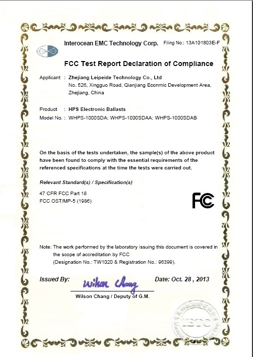 在小功率顺利取得FCC认证的基础上,我公司大功率产品也不负众望顺利通过了FCC认证(2013年10月28日正式获得证书),大功率电子镇流器主要分9种型号:WHPS-400SDC、WHPS-400SDCA、WHPS-400SDCB、WHPS-600SDC、WHPS-600SDCA、WHPS-600SDCB、WHPS-1000SDA、WHPS-1000SDAA、WHPS-1000SDAB。